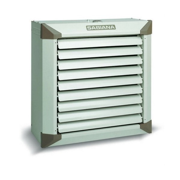 Aerotermo SABIANA ATLAS 46A52 SX 5500-3650m³/h 350/150W 66/56dB, para calefacción por agua caliente y agua sobrecalentada. Fabricados en chapa galvanizada. Destacan por tener una batería pensada, proyectada y construida expresamente para calentar instalaciones industriales, para proyección tanto horizontal como vertical. La batería está fabricada con aletas de aluminio y tubos de acero de gran espesor (1 mm) y diámetro (22 mm), para una robustez y duración excepcionales, con óptima aportación del caudal de aire al rendimiento térmico y elevado confort ambiental. El gran diámetro del tubo reduce la pérdida de carga de las instalaciones de agua, lo que se traduce en una bomba más pequeña y una capacidad de calentamiento muy rápida.