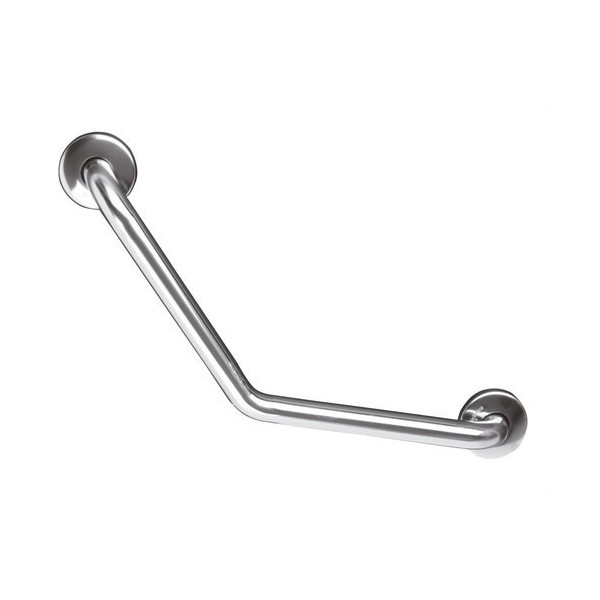 Barra de apoyo en ángulo de 130º, fabricada en acero o acero inoxidable AISI 304, para aseos adaptados. Adecuada para lavabos específicos para personas de edad avanzada o con movilidad reducida. Indicada para conseguir baños y recintos públicos sin barreras arquitectónicas de accesibilidad. Modelo apto para colectividades. Máxima durabilidad y resistencia a la oxidación. Tornillería para pared de ladrillo de acero inoxidable incluida.