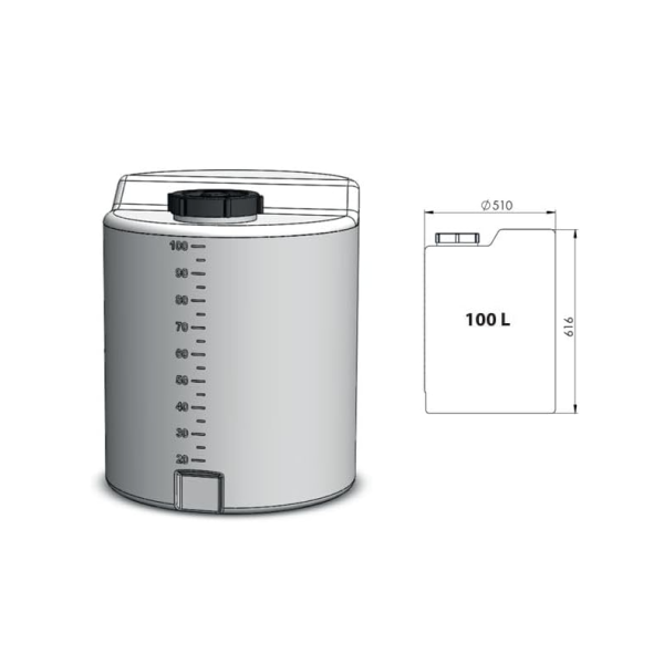 Depósito para bomba dosificadora 100 litros, diámetro 480mm, altura 658mm. Fabricado en Polietileno. Alta densidad, Tapa no hermética. Calidad Alimentaria.