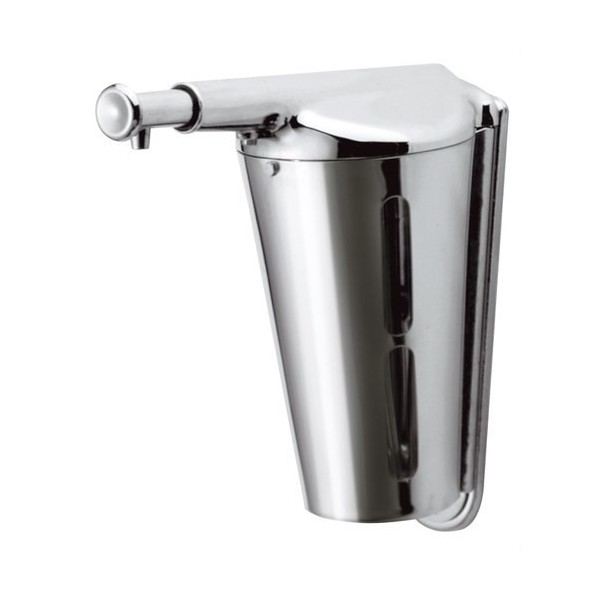 Dispensador de jabón líquido cónico de 0,35 L de capacidad, fabricado en acero inoxidable AISI 304 brillo, de 0,5 mm de espesor, para instalar directamente a la pared y de accionamiento manual a través de un pulsador. Con un diseño funcional, robusto y moderno este dosificador de jabón se integra perfectamente en cualquier ambiente de baño y es adecuado para lavabos con frecuencia de paso media. Dispone de dos visores de nivel de contenido de jabón, en cada uno de los laterales, que permiten visualizar en todo momento el nivel de jabón disponible dentro del dosificador. Se adosa a la pared mediante una placa de acero inoxidable atornillada a la pared en 3 puntos con tornillos de 3 mm (tornillería incluida) Dispone de un cierre de seguridad que se abre con una con una llave especial suministrada. Dispensa jabón líquido o geles hidroalcohólicos. Se recomienda utilizar jabón líquido o desinfectante para manos en forma de gel con las siguientes características: Contenido máximo de alcohol del 80%, Densidad entre 0,9 y 1,35 kg/dm3, Viscosidad entre 500 y 2.500 cps. No admite jabones/geles hidroalcohólicos que contengan metanol, cloro y tampoco partículas sólidas o abrasivos.