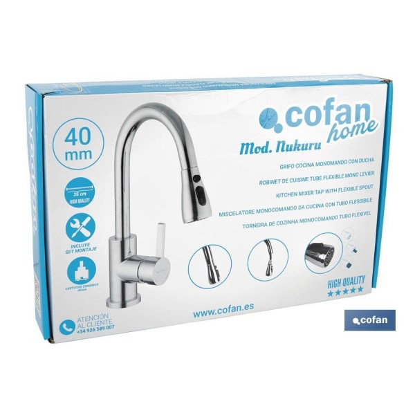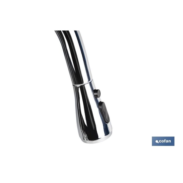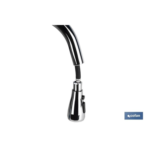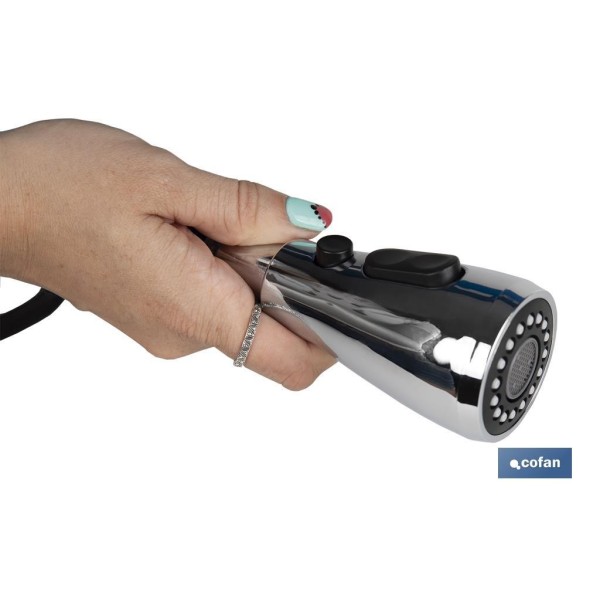 Grifo de cocina monomando con ducha extraíble. Este diseño incorpora dos tipos de chorros: chorro normal y chorro de ducha. El grifo de cocina incorpora un sistema giratorio de 360° por lo que es muy útil para eliminar restos de comida pegados, para una limpieza de rutina o una limpieza intensiva. Gracias a su diseño se adapta a los rincones del fregadero. Este grifo permite un ahorro de agua de más del 40 %. El cuerpo está fabricado en latón con mando en aleación de zinc y manguera de nylon negro de 1,5 metros. Incluye kit de instalación y dos latiguillos flexibles de 35 cm en acero inoxidable.