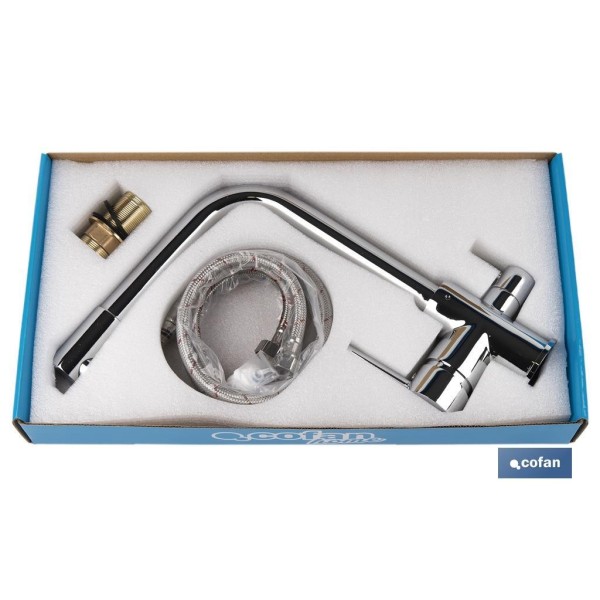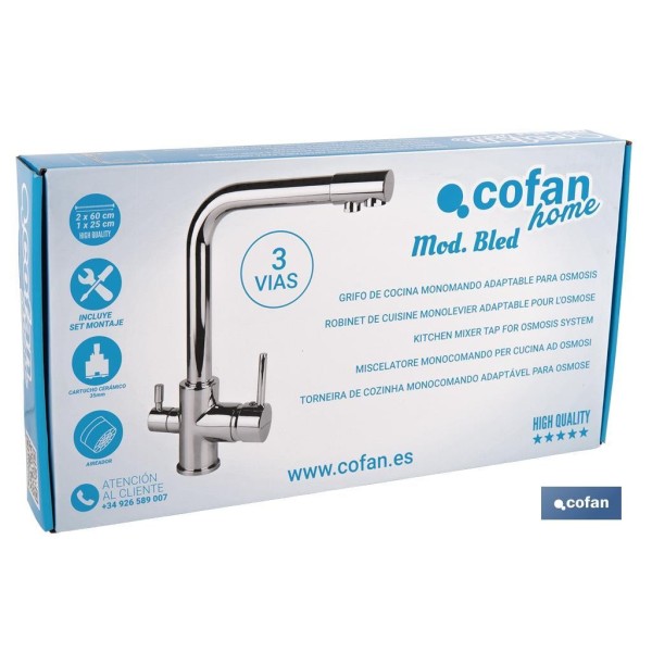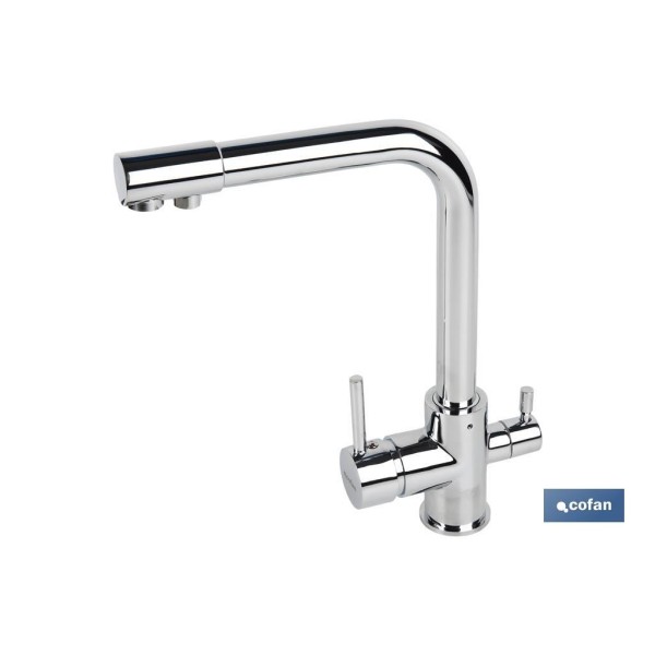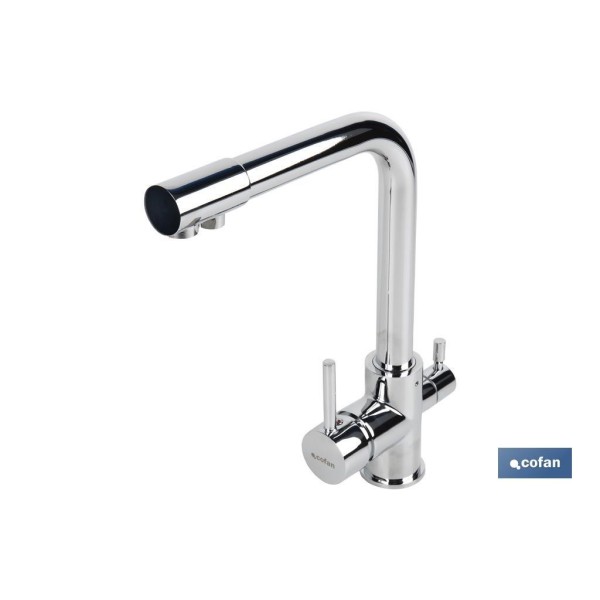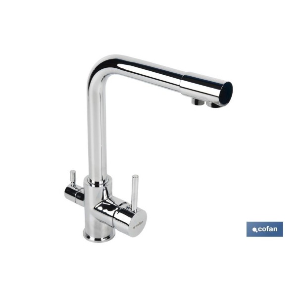 Grifo de cocina monomando adaptable para osmosis. Este grifo incluye 3 funciones: agua fría, agua caliente y osmosis inversa. La osmosis está indicada para descalcificar el agua y eliminar el olor, sabor y bacterias. Sistema de filtrado Osmosis no incluido. El cuerpo del grifo está fabricado en latón con acabado en cromado cuenta con un mando en aleación de zinc. Dispone de un cartucho premium fabricado en cerámico de 35 mm que reduce el riesgo de fugas o goteos y prolonga la vida útil del producto. Incluye kit de instalación.Incluye dos latiguillos flexibles de 60 cm y un latiguillo flexible de 25 cm en acero inoxidable.
