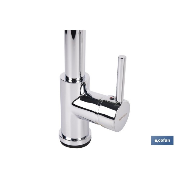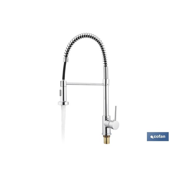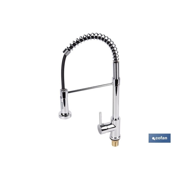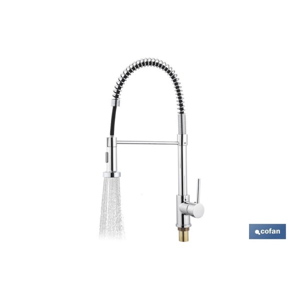 Grifo de cocina monomando con rociador perfecto para combinar elegancia, eficiencia y durabilidad, diseñado para facilitar las tareas diarias en la cocina. Fabricado con un cuerpo de latón, ofrece resistencia a la corrosión y al desgaste, garantizando una larga vida útil incluso en entornos de uso intensivo. Diseñado para máxima versatilidad, cuenta con dos modos de pulverización, permitiendo elegir entre un chorro potente para llenar ollas rápidamente y un rociador para enjuagar las frutas y verduras más delicadas. Cuenta con una boquilla giratoria de 360° que proporciona una maniobrabilidad total, facilitando la limpieza de cada rincón del fregadero sin esfuerzo. El tubo de resorte helicoidal de acero inoxidable y el cabezal rociador de ABS ofrecen flexibilidad y resistencia, mientras que la manguera trenzada de acero inoxidable 304 de 50 cm garantiza un suministro de agua seguro y libre de fugas. Gracias a su conexión estándar y montaje en cubierta, es compatible con instalaciones de uno y tres orificios, lo que permite una instalación sencilla en la mayoría de fregaderos sin necesidad de realizar ningún tipo de adaptación. Con unas medidas de 48 x 22 cm y un diámetro de 5 cm y disponible en acabado cromado metalizado, este grifo es perfecto para quienes buscan calidad, estilo y funcionalidad en la cocina.