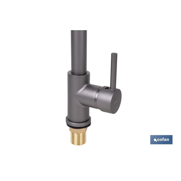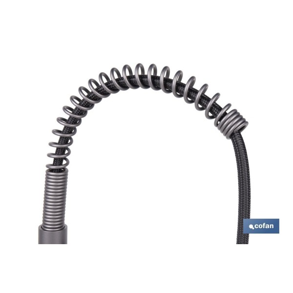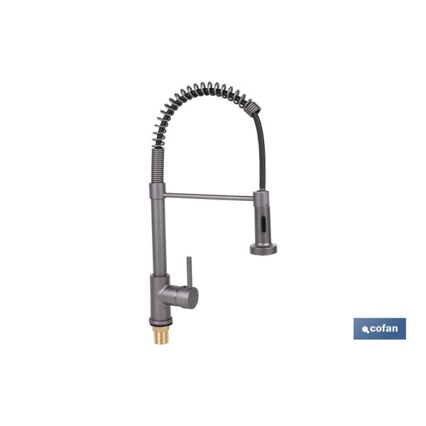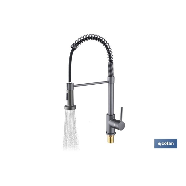 Grifo de cocina monomando con rociador perfecto para combinar elegancia, eficiencia y durabilidad, diseñado para facilitar las tareas diarias en la cocina. Fabricado con un cuerpo de latón, ofrece resistencia a la corrosión y al desgaste, garantizando una larga vida útil incluso en entornos de uso intensivo. Diseñado para máxima versatilidad, cuenta con dos modos de pulverización, permitiendo elegir entre un chorro potente para llenar ollas rápidamente y un rociador para enjuagar las frutas y verduras más delicadas. Cuenta con una boquilla giratoria de 360° que proporciona una maniobrabilidad total, facilitando la limpieza de cada rincón del fregadero sin esfuerzo. El tubo de resorte helicoidal de acero inoxidable y el cabezal rociador de ABS ofrecen flexibilidad y resistencia, mientras que la manguera trenzada de acero inoxidable 304 de 50 cm garantiza un suministro de agua seguro y libre de fugas. Gracias a su conexión estándar y montaje en cubierta, es compatible con instalaciones de uno y tres orificios, lo que permite una instalación sencilla en la mayoría de fregaderos sin necesidad de realizar ningún tipo de adaptación. Con unas medidas de 48 x 22 cm y un diámetro de 5 cm y disponible en acabado gris antracita metalizado, este grifo es perfecto para quienes buscan calidad, estilo y funcionalidad en la cocina.