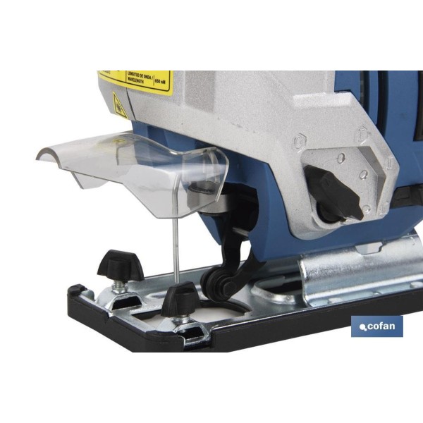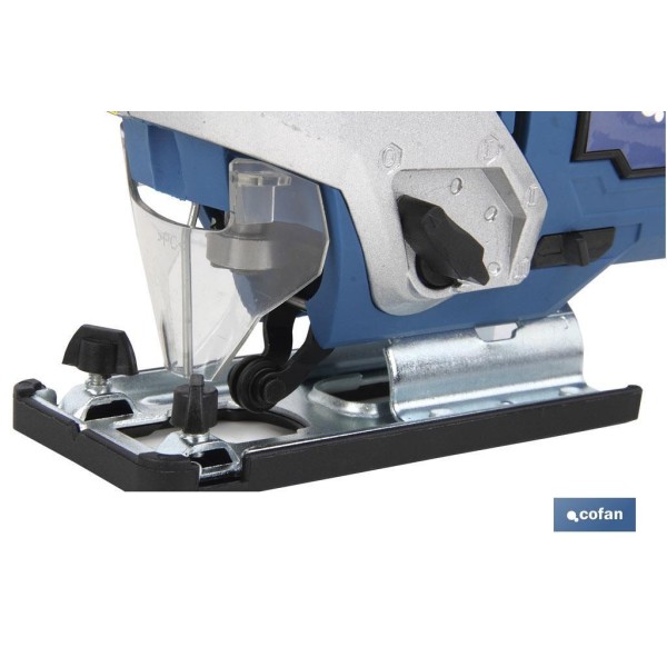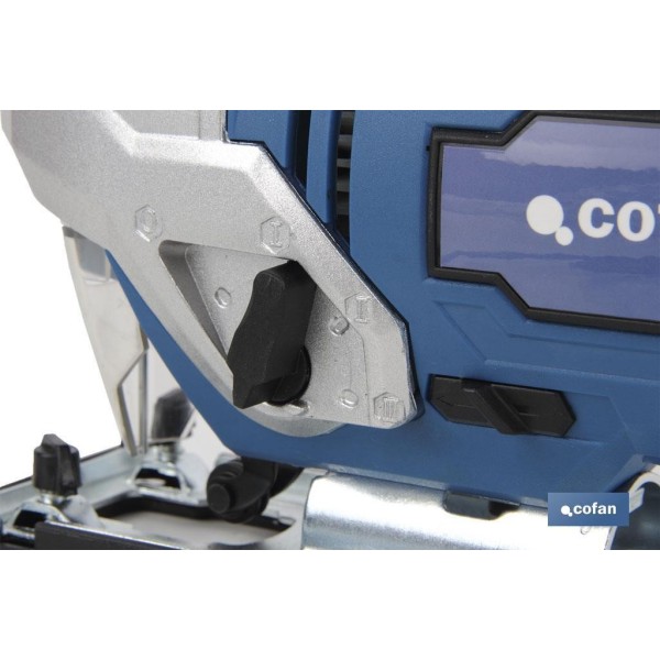Sierra de calar electrónica 800 W 0-45° (0-3000 rpm.) con láser & LED de 6 velocidades variables y corte inclinado ± 45°, con sistema patentado para el cambio automático sin llave de hojas con vástago T, mecanismo antivibración, acción pendular de 4 posiciones, arranque suave, guía de corte láser. Nº RII-AEE de Cofan La Mancha 7038
