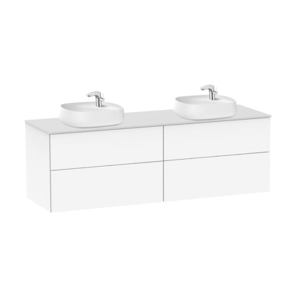 Mueble base de cuatro cajones para dos lavabos de 585 mm de sobre encimera. No incluye lavabos ni grifería. Encimera de cuarzo compacto incluida.