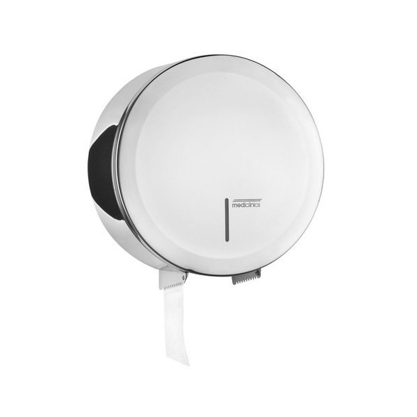 Dispensador de papel higiénico circular manual para adosar a la pared, apto para rollo industrial. Admite rollos de papel de diámetro máximo 230 mm. Diseño actual y de vanguardia, concebido para tener una larga vida útil y ser anti-vandálico. Adecuado para lavabos de frecuencia de paso alta. Modelo apto para colectividades.