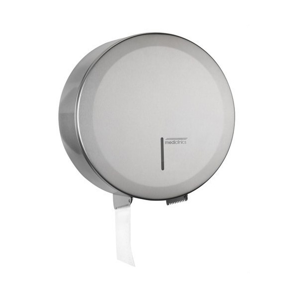 Dispensador de papel higiénico circular manual para adosar a la pared, apto para rollo industrial. Admite rollos de papel de diámetro máximo 274 mm. Diseño actual y de vanguardia, concebido para tener una larga vida útil y ser anti-vandálico. Adecuado para lavabos de frecuencia de paso alta. Modelo apto para colectividades.