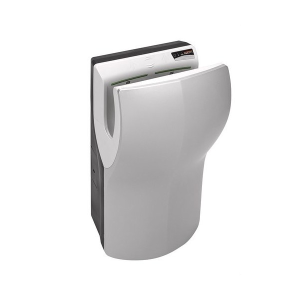 Secamanos auto. Dualflow Plus, de nueva generación, rápido eficiente y de diseño elegante, muy adecuado para lugares con una alta frecuencia de paso. 2 pares de sensores infrarrojos en ambos lados de los embellecedores exteriores para el accionamiento automático. Velocidad máxima de salida del aire a 410 Km/h. Secado de las manos en 10-15 segundos. Motor de potencia ajustable que permite regular el consumo energético (entre 420 y 1.500W). Incorpora un medio filtrante HEPA que filtra las partículas sólidas en suspensión (polen, ácaros del polvo, humo del tabaco, etc) mejorando notablemente la calidad del aire. Puede incorporar, de forma opcional, un ionizador (tecnología "Ion Hygienic") que purifica el aire a través de partículas con carga eléctrica negativa (aniones), eliminando la mayoría de las partículas y los gérmenes transportados por el aire, haciendo que éste sea más saludable y puro. Protección antimicrobiana y antibacteriana Biocote basada en la tecnología de iones de plata. Estos iones inhiben la reproducción de micro-organismos en el producto durante toda su vida útil. Desconexión automática a los 30 segundos de uso continuado. Bajo nivel sonoro en su categoría (62 dBA en modo ECO). De fácil mantenimiento, se puede conectar, de forma opcional, directamente la cañería de desagüe principal del baño para eliminar el agua residual del secado de manos. Dispone de unas bolitas neutralizadoras de olores, código RCFB001 que aromatizan y desodorizan el ambiente gracias a su suave fragancia (opcional).