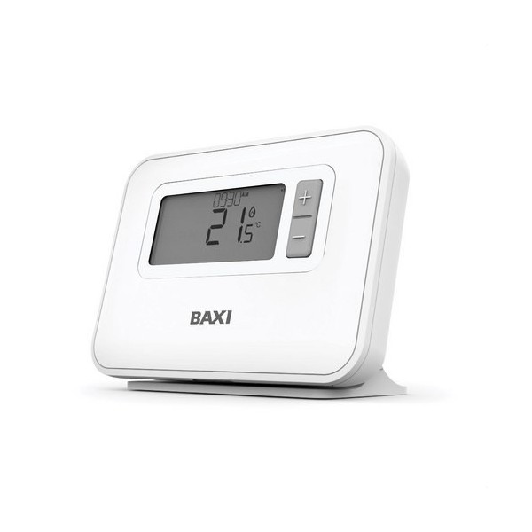 Termostato RX 3000 Termostato ambiente programable inalámbrico digital marca BAXI. Incluye un receptor para instalar al lado de la caldera. Instalación en la pared o encima de un mueble gracias al soporte que se incluye. Equipados de un código que imposibilita interferencias de otros termostatos inalámbricos. Modo Calefacción / Refrigeración. Pantalla retroiluminada de gran tamaño. Programa de calefacción diario, semanal o 5+2. Hasta 6 cambios diarios de nivel de temperatura. Funcionamiento manual o automático. Programa especial para períodos de ausencia o vacaciones. Función antihielo (t < 5°C). Alimentación independiente de la red mediante 2 baterías de 1,5 V. Clasificación ErP: IV Contribución a la eficiencia según ErP: 2%